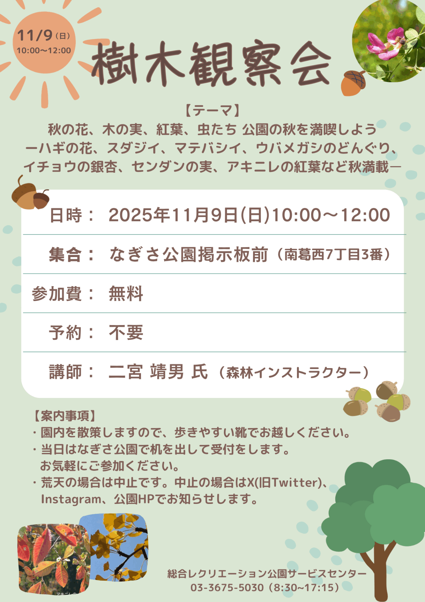 2025年11月9日(日)10:00~12:00になぎさ公園にて「樹木観察会」を開催します!