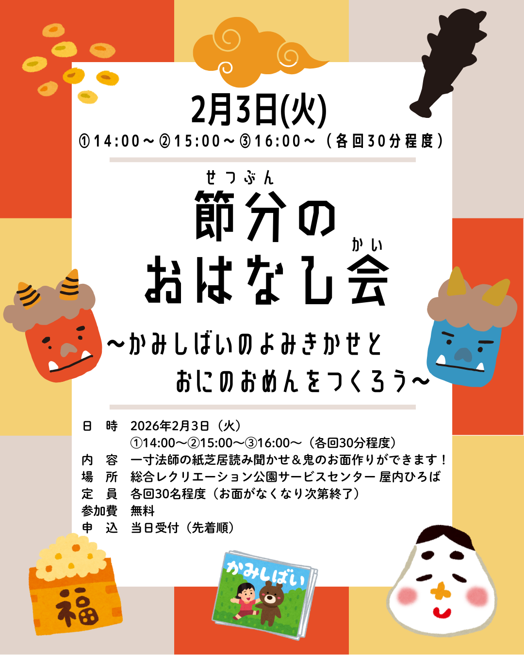 内 容 一寸法師の紙芝居読み聞かせ&鬼のお面作りができます!