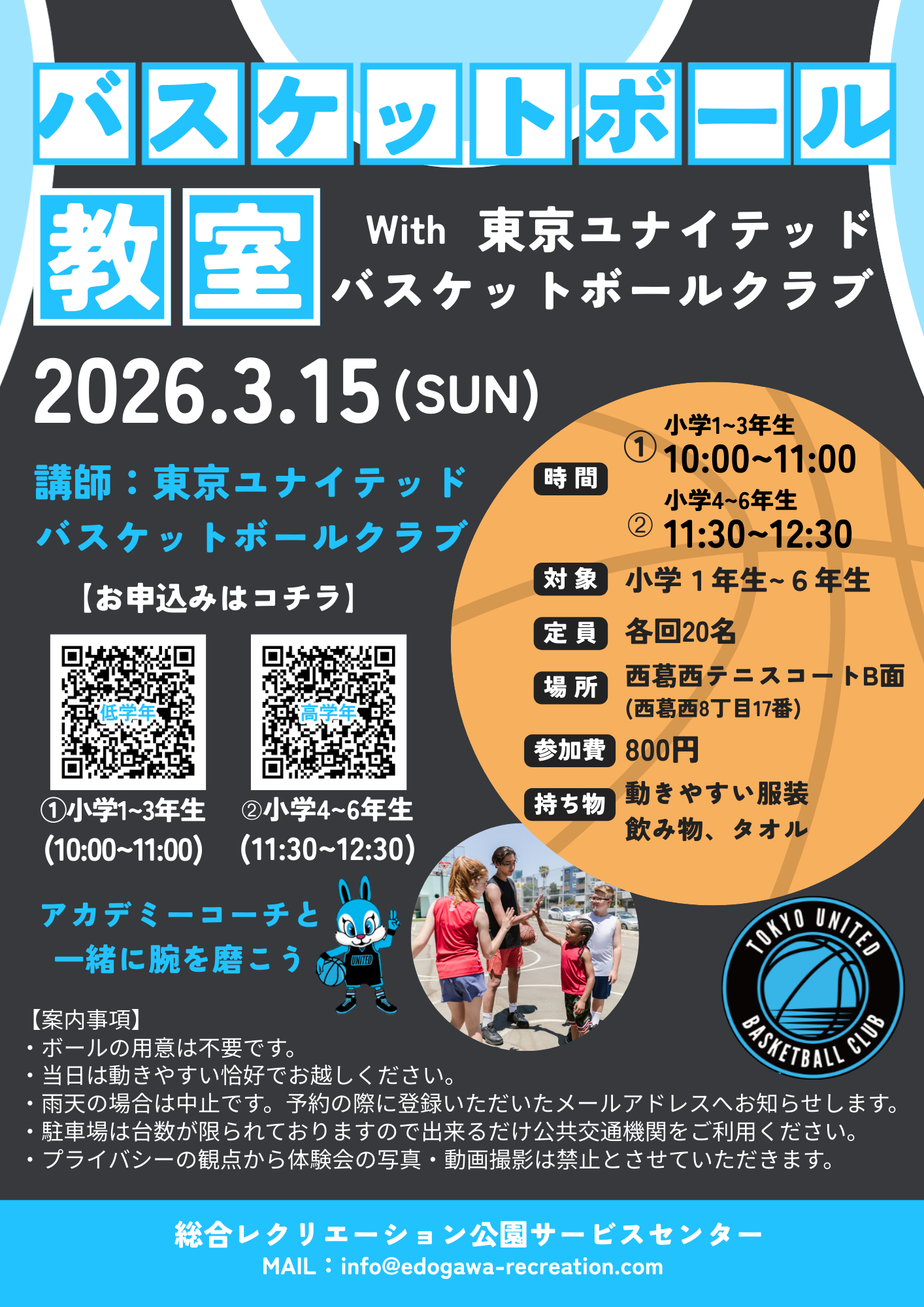 2026年3月15日(日)に「バスケットボール教室with東京ユナイテッドバスケットボールクラブ 」を開催いたします!