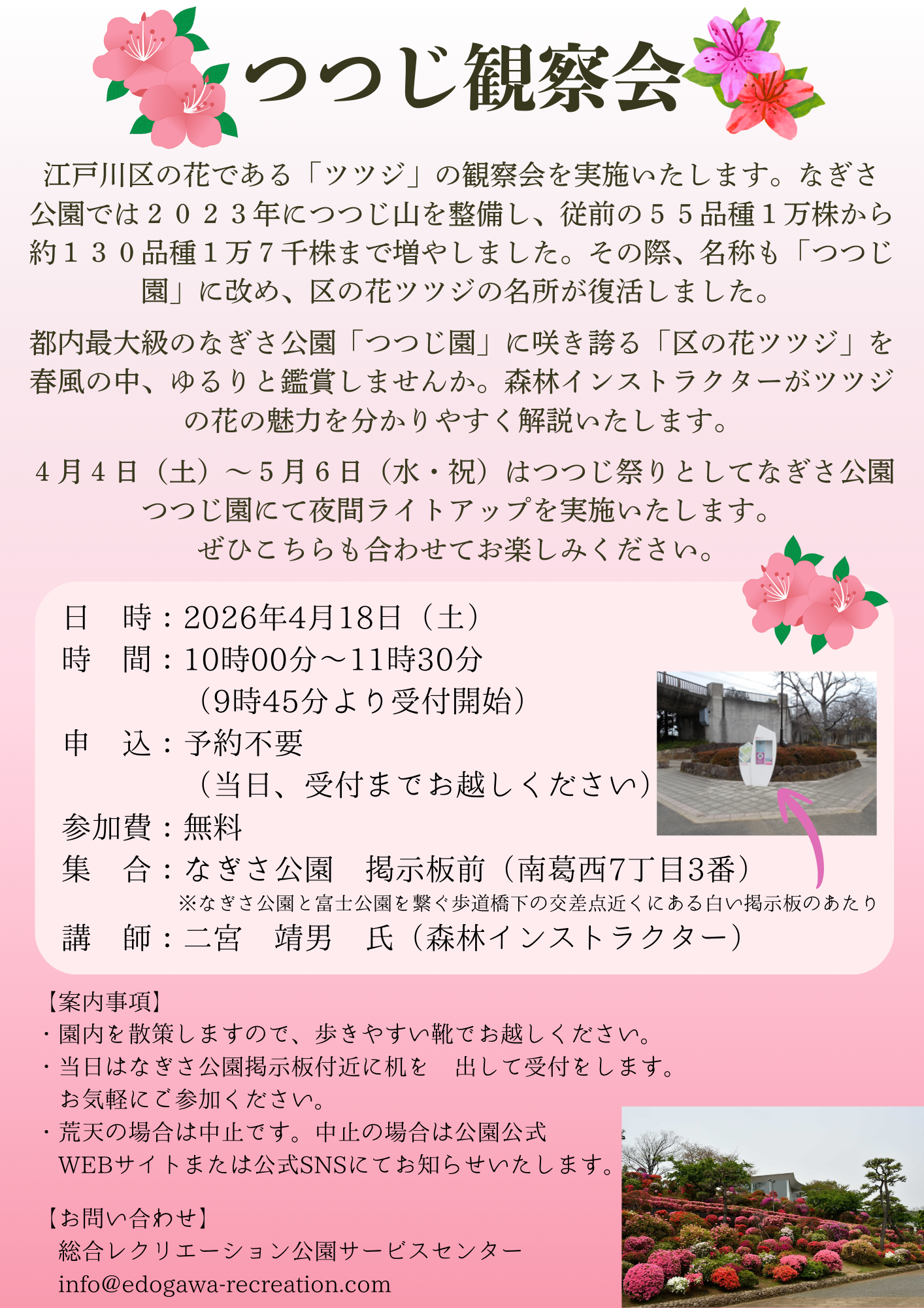 江戸川区の花である「ツツジ」の観察会を実施いたします。なぎさ公園では2023年につつじ山を整備し、従前の55品種1万株から約130品種1万7千株まで増やしました。その際、名称も「つつじ園」に改め、区の花ツツジの名所が復活しました。