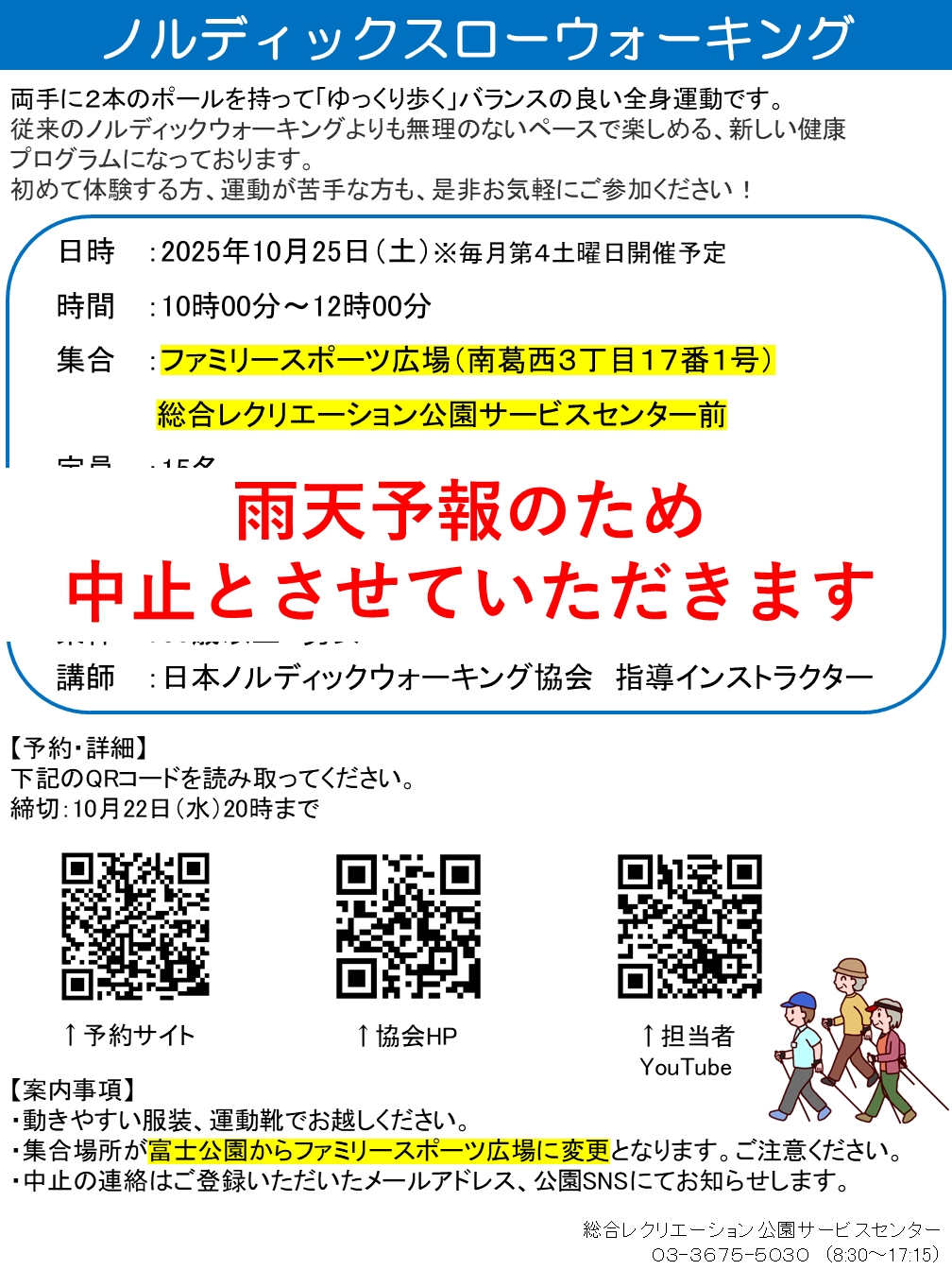 本日2025年10月25日(土)開催予定のノルディックスローウォーキングですが、雨天のため中止とさせていただきます。