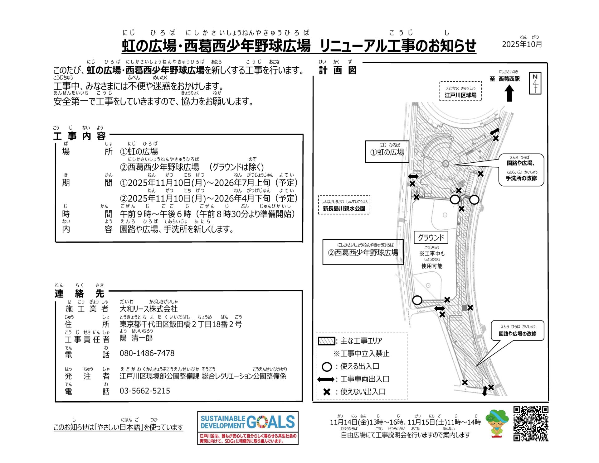 いつも総合レクリエーション公園をご利用いただきありがとうございます。 総合レクリエーション公園のリニューアル事業につきまして、虹の広場、西葛西少年野球広場の工事を開始いたします。 詳細については工事チラシを掲載しますので、ご覧ください。 虹の広場、西葛西少年野球広場工事お知らせチラシ