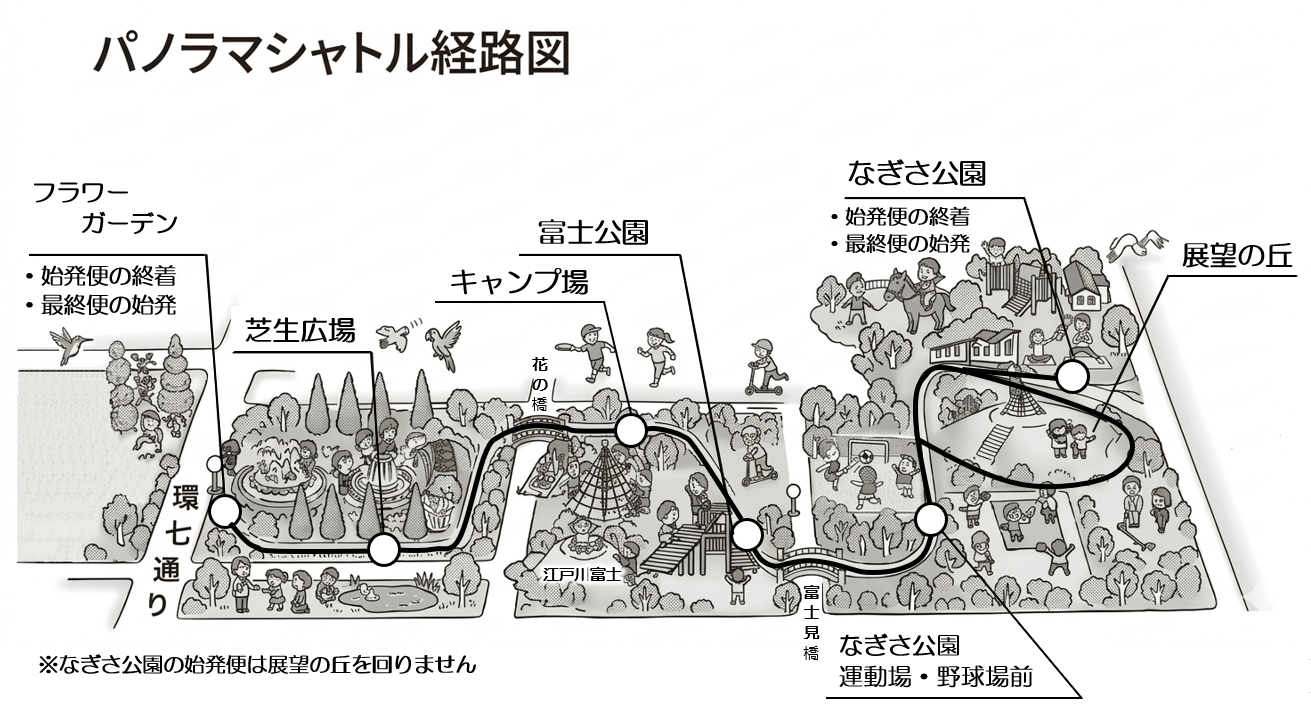 総合レクリエーション公園のなぎさ公園・富士公園・フラワーガーデンを走る園内バスです。